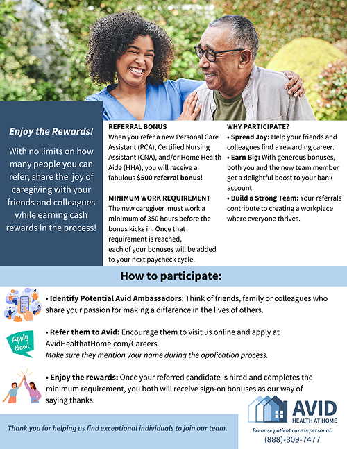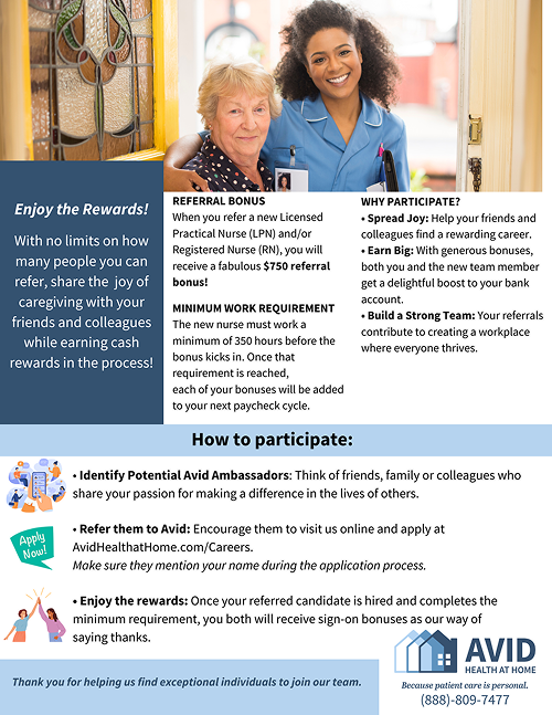 As part of the Avid Health at Home family, you’ll be among caring and compassionate individuals who are dedicated to making a difference. By joining our team, you will have access to specialized training and opportunities for professional certifications to help you grow in your role. At Avid, you’re not just joining a team; you’re stepping into a role that enhances lives, including your own.